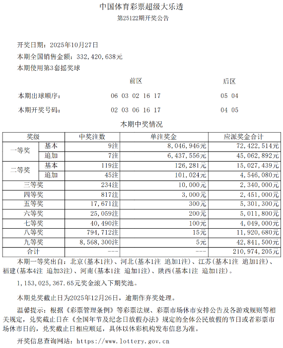 10月27日,超级大乐透第25122期开奖。前区开出号码02、03、06、16、17 ;后区开出号码04、05。本期全国销售3.32亿元,为国家筹集彩票公益金1.19亿元。